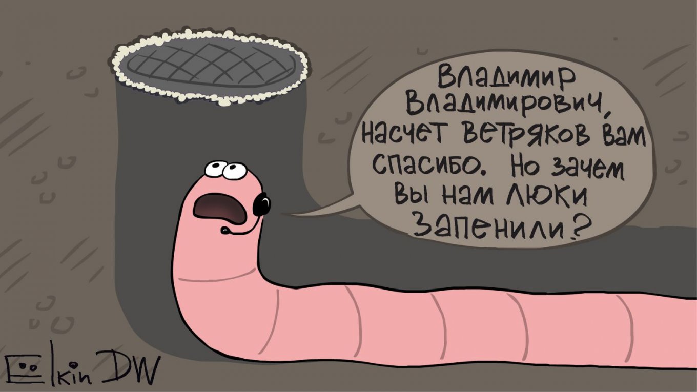 Заявление президента России Владимира Путина о том, что отказ от традиционных источников энергии и использование альтернативных способов ее получения, в частности, ветряков, плохо отразиться на окружающей среде и поспособствует вылезанию из земли червей, меткой карикатурой высмеял Сергей Елкин.
