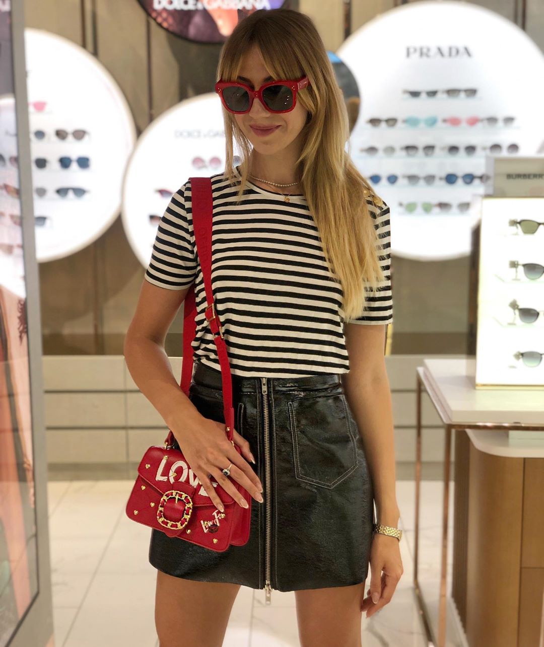 Образ довершает простая футболка в черно-белую полоску. Но примечательны именно аксессуары. Телеведущая подобрала комбинацию в алых тонах - массивные солнцезащитные очки с красной оправой, а также маленькую красную сумочку через плечо с массивной пряжкой. Вышел стильный и эффектный образ на лето.
