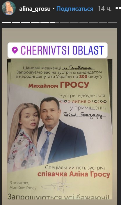 Бывший депутат Черновицкого горсовета и бизнесмен Михаил Гросу баллотируется как беспартийный самовыдвиженец. Об этом стало известно из Instagram-сториз 24-летней исполнительницы, которая опубликовала соцсети фото печатных приглашений на встречи с кандидатом. Сама Алина Гросу намерена выступать на мероприятиях в качестве специального гостя.