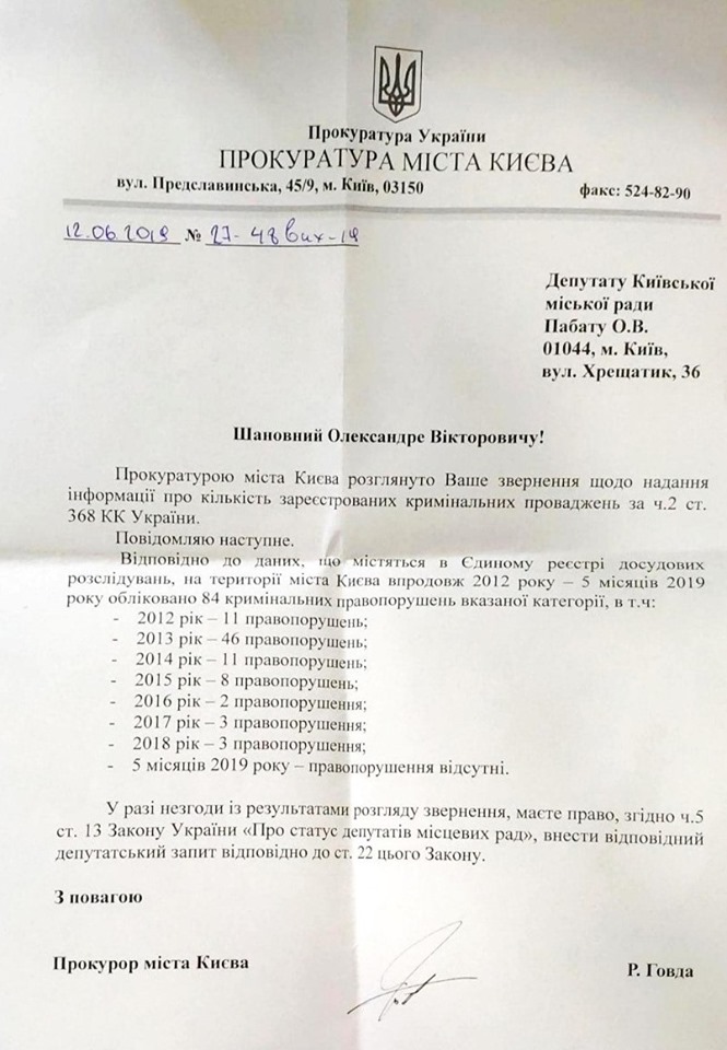 За 5 месяцев нынешнего года не зарегистрировано ни одного уголовного производства по факту получения взятки в особо крупном размере. Об этом говорится в ответе прокуратуры Киева на запрос депутата Киевсовета Александра Пабата.