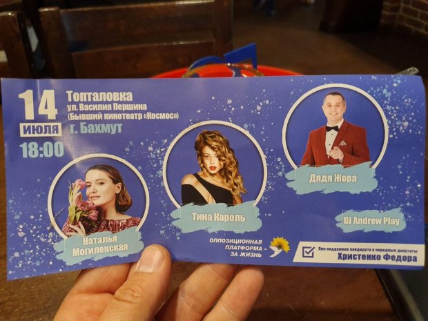 В Бахмуте на Донбассе раздавали скандальные листовки с приглашением на концерт популярных украинских звезд Тины Кароль, Натальи Могилевской и Дяди Жоры. А сам скандал заключается в том, что на мероприятие людей приглашает кандидат от "Пппозиционной платформы – За жизнь" Федор Христенко.