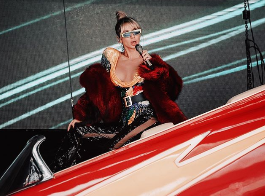 Об этом рассказала сама исполнительница на своей странице в Instagram. 36-летняя знаменитость опубликовала фото с недавнего концерта в РФ, на котором она запечатлена на висящей над сценой конструкции.