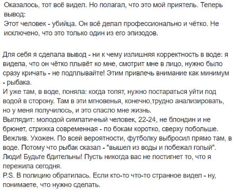 "Я видела, как по дамбе бежит молодой человек в чёрной футболке. Моё внимание привлекло то, что он, не останавливаясь, не раздевшись, по крутому бетонному спуску забежал в реку и сразу поплыл. Прямо на меня. Это было странно, я его не знаю. Ему лет 20-24. Он подплыл. Смотрит прямо на меня, в лицо. Я сказала, что раздетым плавать комфортнее - по-матерински, по-доброму. Он тут же снял футболку. Я сказала - правда же, лучше? Он сказал:"Не разговаривайте". Именно так - вежливо и на "Вы", - написала она.