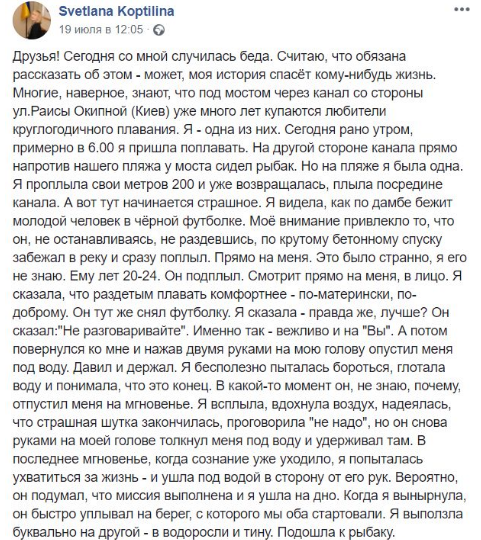 "Я бесполезно пыталась бороться, глотала воду и понимала, что это конец. В какой-то момент он, не знаю, почему, отпустил меня на мгновенье. Я всплыла, вдохнула воздух, надеялась, что страшная шутка закончилась, проговорила "не надо", но он снова руками на моей голове толкнул меня под воду и удерживал там. В последнее мгновенье, когда сознание уже уходило, я попыталась ухватиться за жизнь - и ушла под водой в сторону от его рук. Вероятно, он подумал, что миссия выполнена и я ушла на дно. Когда я вынырнула, он быстро уплывал на берег", - рассказала перепуганная девушка.