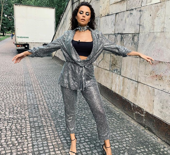 Настя одета в серебристый летний костюм и темный облегающий топ, который прекрасно подчеркивает пышноту Настиного бюста. Прическу в этот раз Каменских выбрала необычную. Так, певица ассоциируется с пышной кудрявой шевелюрой, а для фото Настя решила уложить волосы и сделать "мокрый" эффект.