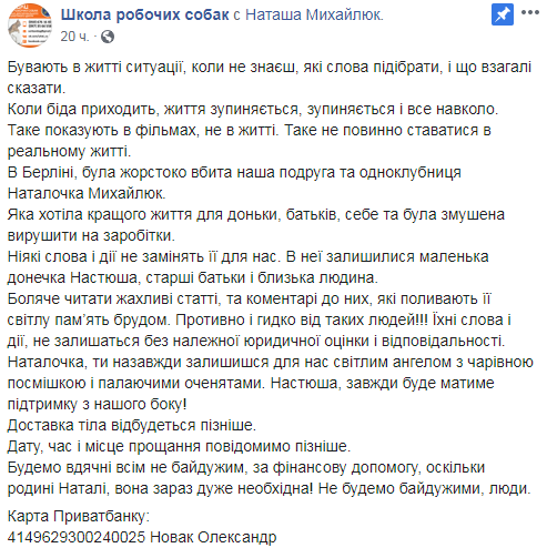 "Больно читать ужасные статьи, и комментарии к ним, которые поливают ее светлую память грязью. Противно и гадко от таких людей! Их слова и действия не останутся без надлежащей юридической оценки и ответственности. Наташа, ты навсегда останешься для нас светлым ангелом с очаровательной улыбкой и горящими глазами. Настюша всегда будет иметь поддержку с нашей стороны! Доставка тела состоится позже... Будем благодарны всем неравнодушным за финансовую помощь, поскольку семье Натальи, она сейчас очень необходима!", – говорится в сообщении.