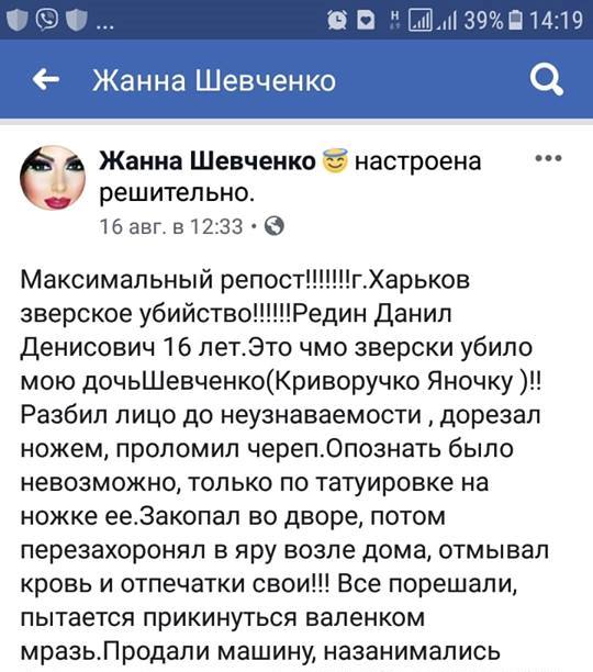 Несколько дней Яну искали родня, знакомые, волонтеры и полиция. Нашли девушку убитой. Труп был в страшном состоянии – тело порезано ножом, лицо изуродовано.
