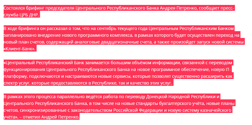Вот один из пазлов, который есть в открытом доступе. Так называемый "ЦРБ ДНР" объявил о переходе на новый план расчетов (архив). С 19 августа начался перевод на новые расчеты и физических лиц. Фото с расшифровкой новой структуры счетов, которая будет принята.