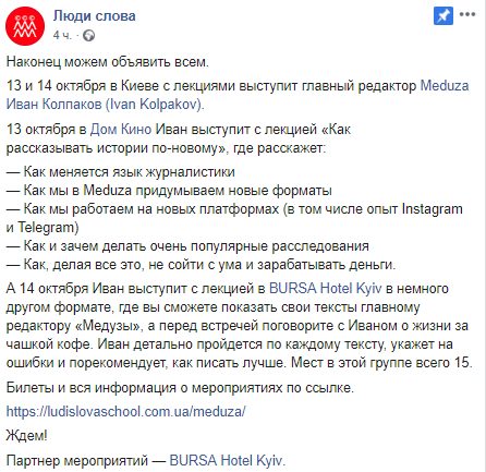 "13 и 14 октября в Киеве с лекциями выступит главный редактор "Медуза" Иван Колпаков. 13 октября в Дом Кино Иван выступит с лекцией "Как рассказывать истории по-новому", где расскажет: как меняется язык журналистики, как мы в "Медузе" придумываем новые форматы, как мы работаем на новых платформах (в том числе опыт Instagram и Telegram), как и зачем делать очень популярные расследования, как, делая все это, не сойти с ума и зарабатывать деньги", - говорится в сообщении копирайтингового агентства "Люди слова" в Facebook..