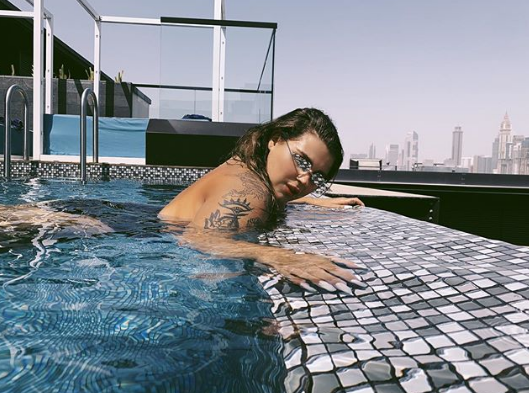 Пикантное фото в бассейне появилось на странице группы. Сейчас Саша в ОАЭ в Дубае. Девушка соблазнительно купается в бассейне и частично выглядывает из него, облокотившись на бортик. Пикантности образа предоставляет мокрые волосы, очки и татуировки на верхней части руки певицы.