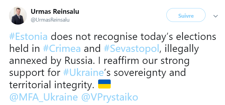 Министр иностранных дел Эстонии Урмас Рейнсалу присоединился к странам, которые не признают проведения выборов в оккупированном Россией Крыму и Севастополе. Об этом он сообщил на своей странице в Twitter.