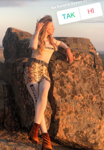 Леся позирует на фоне вековечных каменных глыб с высеченными надписями. На ней уже знакомый поклонникам наряд – комбинезон в обтяжку телесного цвета с крупными надписями и юбка "питонового" окраса. На ножках – замшевые полусапожки.