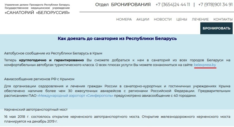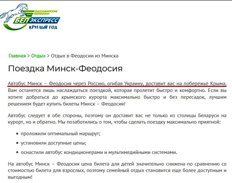 Как сообщается в расследовании, информационный ресурс Управления делами президента Лукашенко Центркурорт предлагает осуществлять нарушение режима пересечения украинской государственной границы, рекламирует компанию, осуществляющую незаконное транспортное сообщение Беларуси с Крымом в обход материковой части Украины.