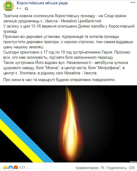 "В связи с гибелью бойца ВСУ 15-16 сентября объявлены днями траура", - говорится в сообщении.