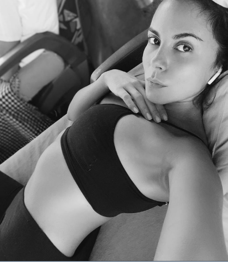 На ней темные лосины и короткий топик, который оголил плоский животик.