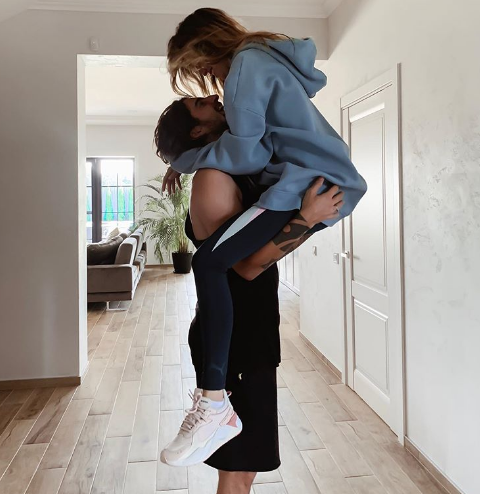 Дантес держит возлюбленную на руках. Муж и жена одеты в повседневную домашнюю одежду в спортивном стиле.