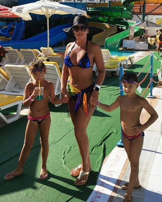 Певица Камалия сфотографировалась в купальнике возле бассейна, отдыхая в Турции. Также в кадр попали ее дети-близнецы. На певице был одет синего цвета купальник и черная шляпа.