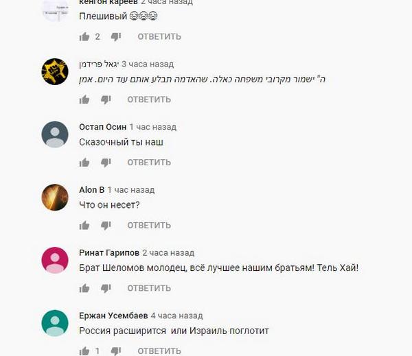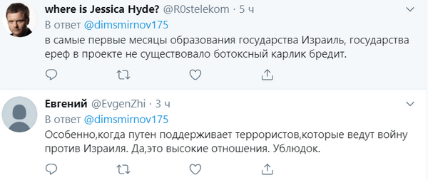 «Особенно, когда Путин поддерживает террористов, которые ведут войну против Израиля. Да, это высокие отношения. Ублюдок», «Губы закатай, ничего от Израиля тебе не светит», «В самые первые месяцы образования государства Израиль, государства РФ в проекте не существовало, ботоксный карлик бредит».