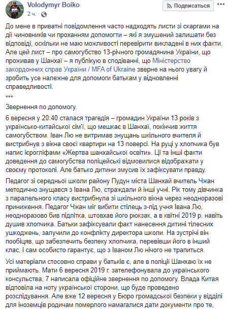 Подробнее о случившемся рассказал журналист Владимир Бойко на своей страничке в соцсети: “6 сентября около девяти часов вечера 13-летний Иван Лю, который воспитывался в украино-китайской семье покончил жизнь самоубийством, он не смог выдержать издевательства и насмешки со стороны школьного учителя и выпрыгнул из окна. На бездыханном теле иероглифами была выведена надпись “жертва шанхайского образования”. Мать школьника рассказала, что полицейские Шанхая отказались расследовать дело о доведении до суицида.