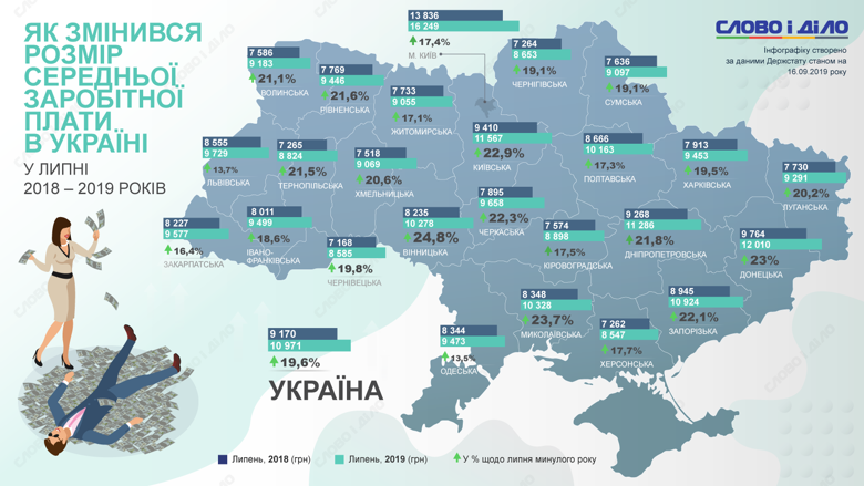Наибольший рост зафиксирован в Винницкой области, где в июле 2018 года средняя зарплата составляла 8 тыс. 235 грн, а в 2019-м – 10 тыс. 278 грн (+ 24,8%).