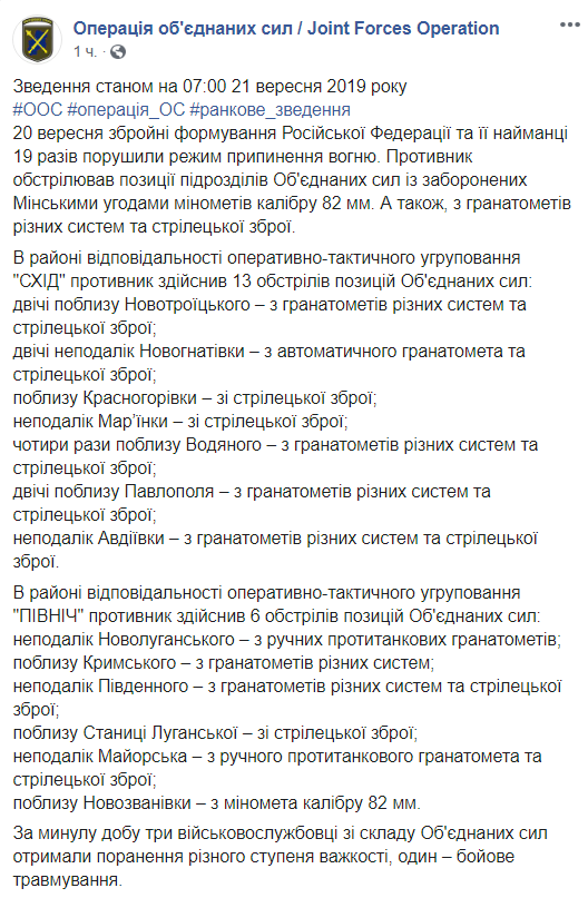 В пятницу, 20 сентября, боевики 19 раз нарушили режим прекращения огня в зоне боевых действий на Донбассе.