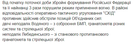 "За минувшие сутки трое военнослужащих из состава Объединенных сил получили ранения различной степени тяжести, один - боевое травмирование", - сказано в сообщении.