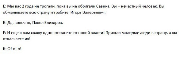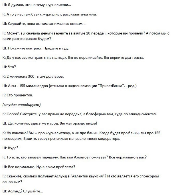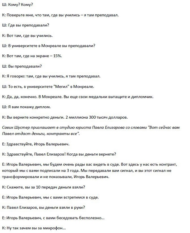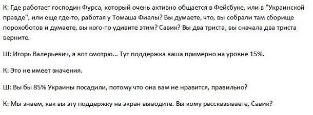 "Игорь Валерьевич, я вот смотрю... Тут поддержка ваша примерно на уровне 15%. - То не имеет значения. - Вы бы 85% Украины посадили, потому что она вам не нравится, правильно?" – спросил Шустер.