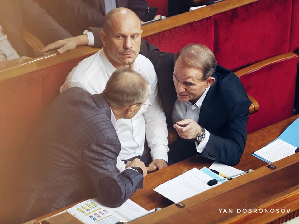 На снимке зафиксировано, как нардеп Виктор Медведчук общается со своим коллегой по парламенту. При этом общение происходит "через" другого депутата от "Оппозиционной платформы", Илью Киву.