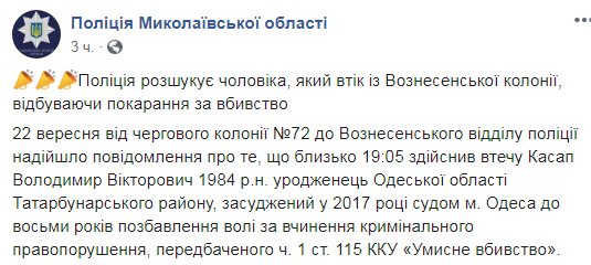 "22 сентября от дежурного колонии №72 в Вознесенский отдела полиции поступило сообщение о том, что около 19:05 совершил побег Касап Владимир Викторович 1984 года рождения, уроженец Одесской области Татарбунарского района, который был осужден в 2017 году", – говорится в сообщении.