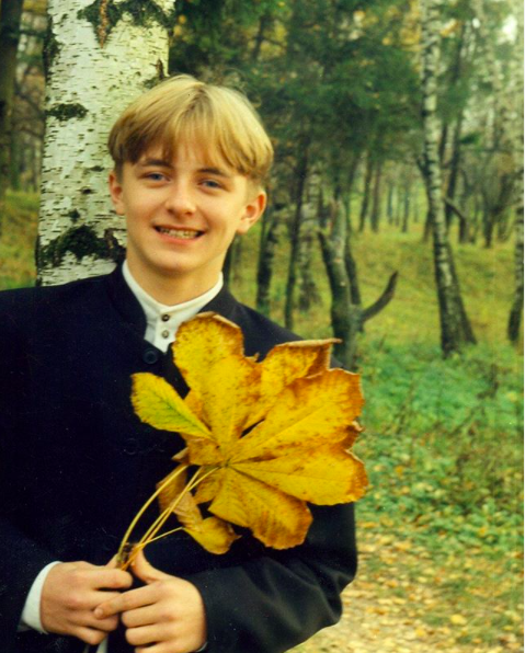 У Михаила была стильная на то время стрижка с челкой. На снимке артист позирует в черном пальто, белой рубашке и с желтыми листьями в руках.