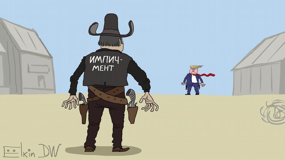 Картинку автор Сергей Елкин нарисовал в стиле Дикого Запада. Он изобразил импичмент в виде ковбоя с револьверами. Напротив него стоит Трамп, у которого на ветру развевается красный галстук.
