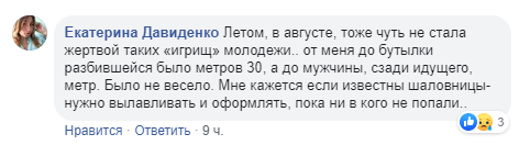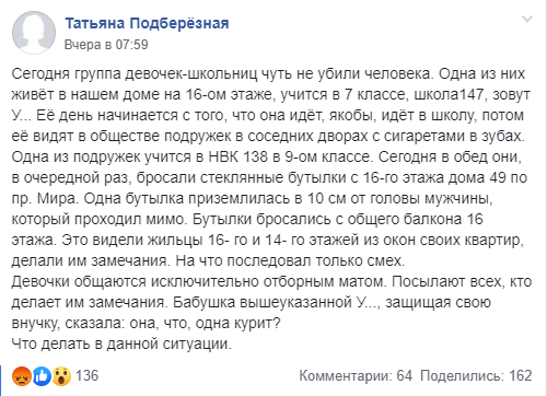 По словам соседей малолетних бандиток, семиклассницы постоянно дебоширят и ведут себя неадекватно, на замечания взрослых девочки не реагируют. О шокирующем поведении учениц на своей странице в Facebook написала свидетельница происшествия Татьяна Подберезная.Как сообщила жительница дома, школьницы распивали алкоголь и бросали стеклянные бутылки с 16-го этажа, не обращая внимание на людей. Одна из бутылок приземлилась в нескольких сантиметрах от головы прохожего мужчины. По ее словам, соседи неоднократно делали замечания школьницам, но они просто смеялись в ответ и матерились.