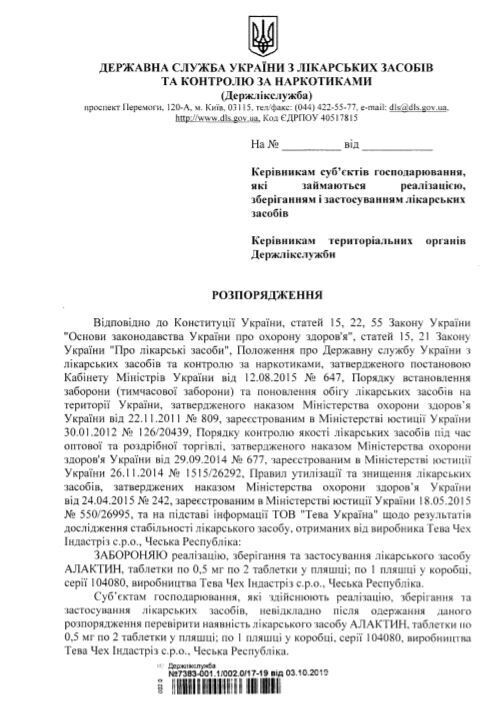 Алактин тоже получил запрет из-за низкого качества. Это лекарство снижает уровень пролактина, а также применяется при аденоме гипофиза. Госслужба запретила продажу таблеток по 0,5 мг по 2 таблетки в бутылке компании "Тева Чех Индастриз с.р.о." серии №104080.