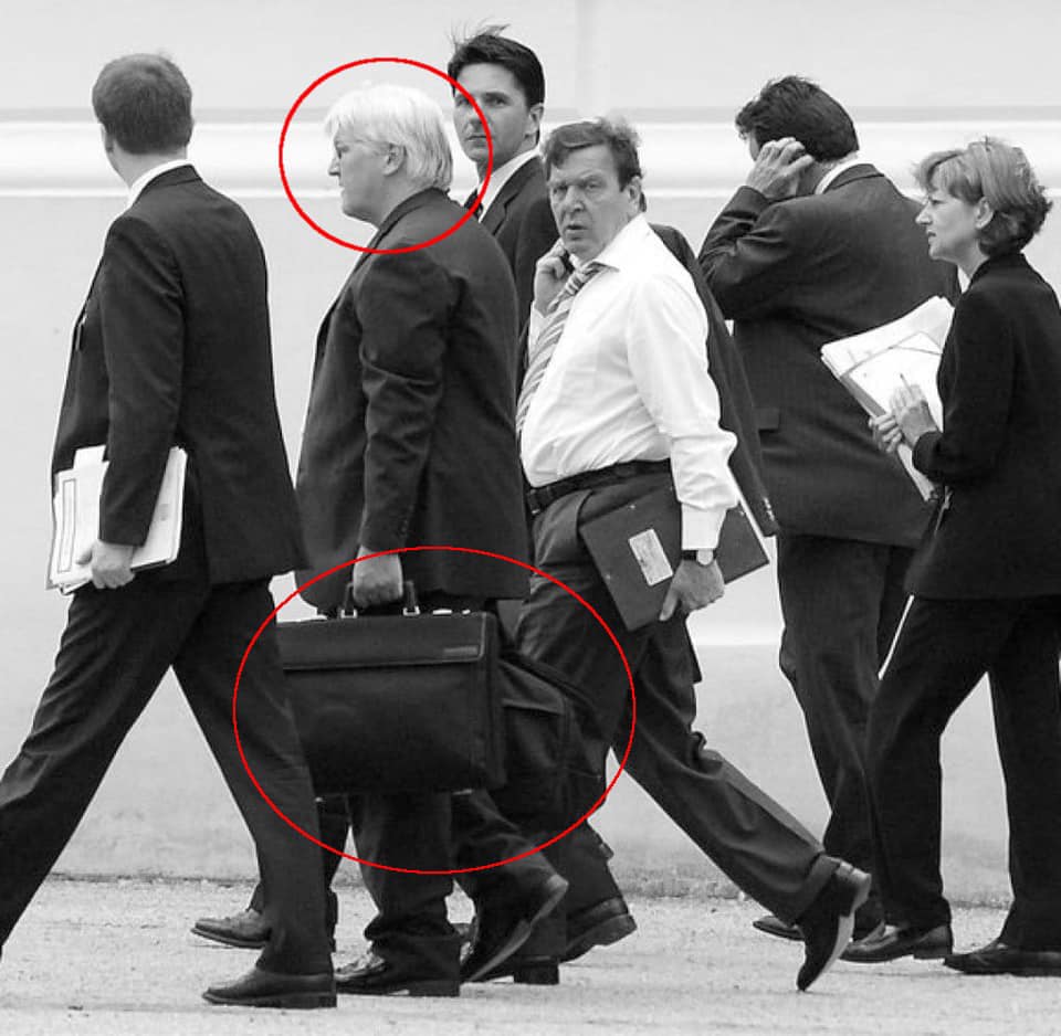 Рядом также опубликовали снимок, на котором Штайнмайер в более молодом возрасте несет портфель бывшего немецкого канцлера Герхарда Шредера.