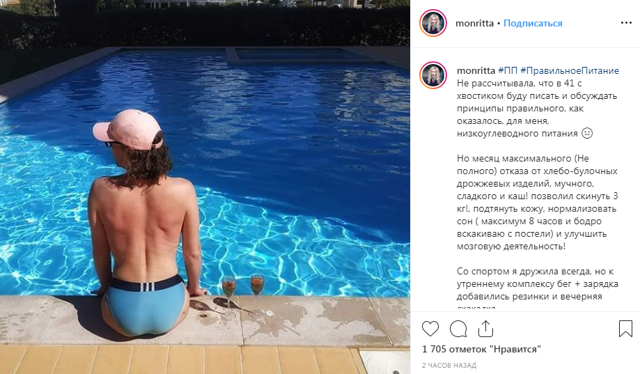 «…Месяц максимального (не полного) отказа от хлебобулочных дрожжевых изделий, мучного, сладкого и каш позволил скинуть 3 кг!, подтянуть кожу, нормализовать сон (максимум 8 часов и бодро вскакиваю с постели) и улучшить мозговую деятельность! Со спортом я дружила всегда, но к утреннему комплексу бег + зарядка добавились резинки и вечерняя скакалка…» – написала Монро.