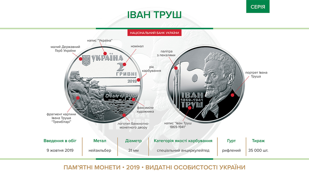 С сегодняшнего дня в Украине в обращение вводится новая памятная монета номиналом 2 гривны, посвященная художнику Ивану Трушу. Об этом сообщает НБУ.
