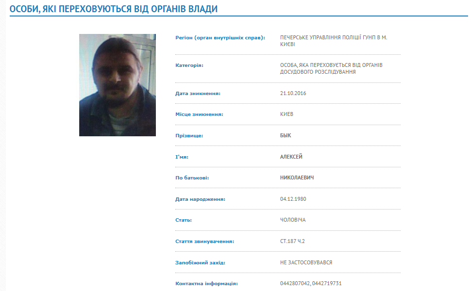 Согласно информации, размещенной на сайте МВС, Алексей Бык действительно пребывает в розыске.
