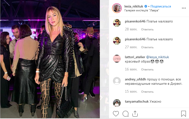 В кадре Никитюк предстала в соблазнительном "луке": в черном дерзком мини-платье с объемными рукавами и оригинальных колготках с анималистическим принтом.