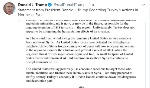 "Я разгромил 100% халифат ИГ и после этого в основном вывел наши войска из Сирии", – написал американский лидер в Twitter в понедельник, 14 октября.