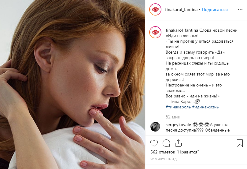 "Слова новой песни «Иди на жизнь»! «Ты не против учиться радоваться жизни! Всегда и всему говорить «Да», закрыть дверь во вчера! На ресницах слёзы и ты сидишь дома,за окном сияет этот мир, за него держись! Настроение не очень - и это знакомо...Все равно - иди на жизнь!» - подписала фото певица.