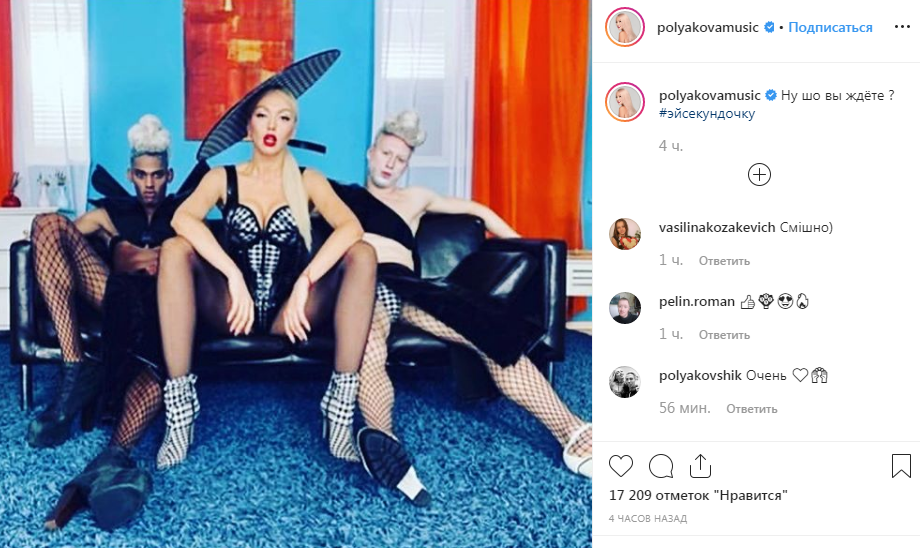 «@polyakovamusic За что ты так с парнями-то ?», «Дааааа», «Аля Мaruv», «Ждём, очень ждём!», «Желаю тебе счастья, да-да тебе», «Я лично жду фото в качестве) а не вот это все », «Оля, шо за «бартер»?))», «Да, мне тоже на Марув похоже…», «Блин ноги длиннее чем у Пацанов, огонь», «ужас,..все хуже и хуже… пошло. Когда премьера??? », «Нагадало Марув».