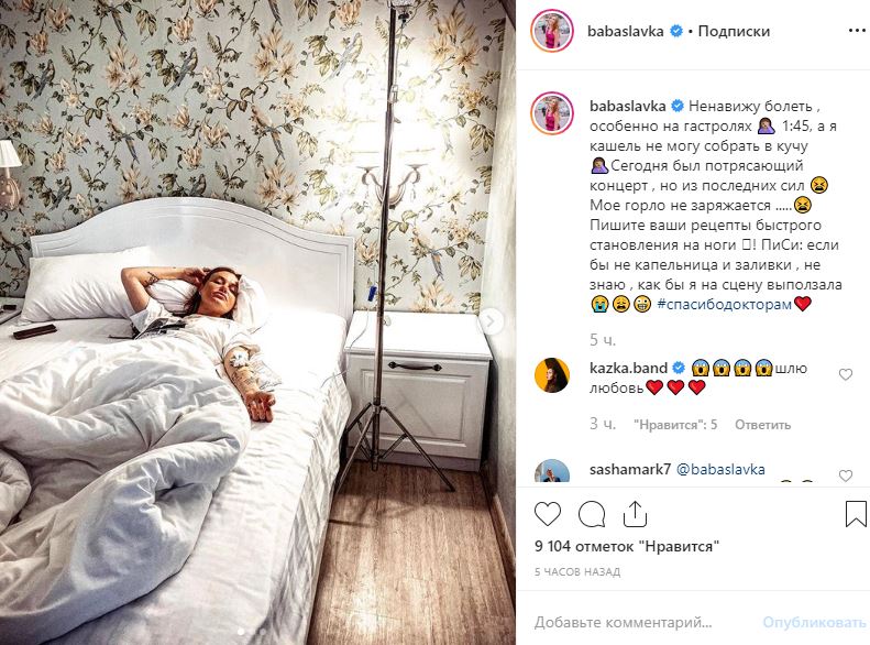 «Ненавижу болеть, особенно на гастролях.1:45, а я кашель не могу собрать в кучу. Сегодня был потрясающий концерт, но из последних сил. Мое горло не заряжается», — пожаловалась она.