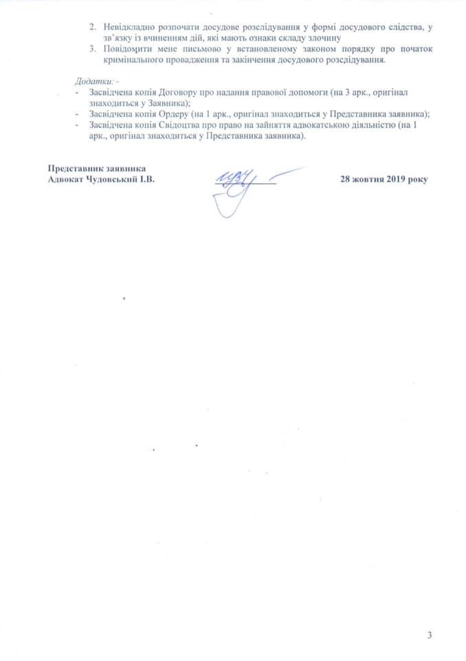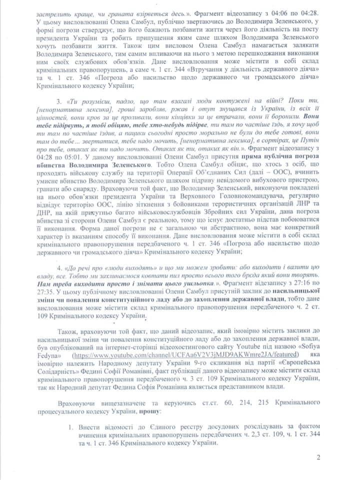 "Подал вчера заявление о совершении преступлений на имя Председателя СБУ Ивана Баканова, Генерального прокурора Украины Руслана Рябошапки, Министра МВД Арсена Авакова и Директора ГБР Романа Трубы, которые могут содержать в себе состав уголовных преступлений предусмотренных ч. 2 ст. 109. Действия, направленные на насильственное изменение или свержение конституционного строя или на захват государственной власти, ч. 1 ст. 344. Вмешательство в деятельность государственного деятеля, ч. 1 ст. 346 Статья 346. Угроза или насилие в отношении государственного или общественного деятеля Уголовного кодекса Украины. Согласно статье 1 Конституции Украины - правовое государство и я считаю недопустимым, когда отдельные активисты или народные депутаты позволяют себе призывы к насильственному свержению власти путем физической расправы над Президентом Украины! "- написал Александр Качура.