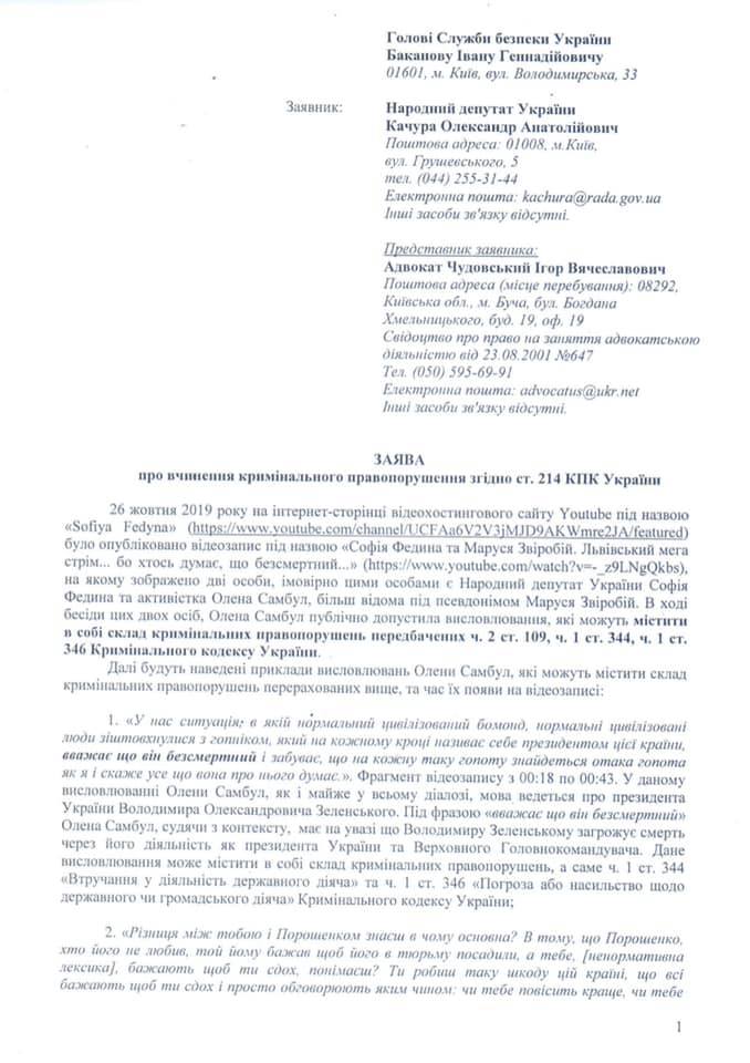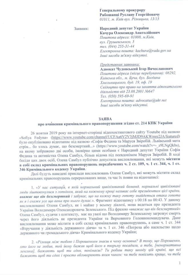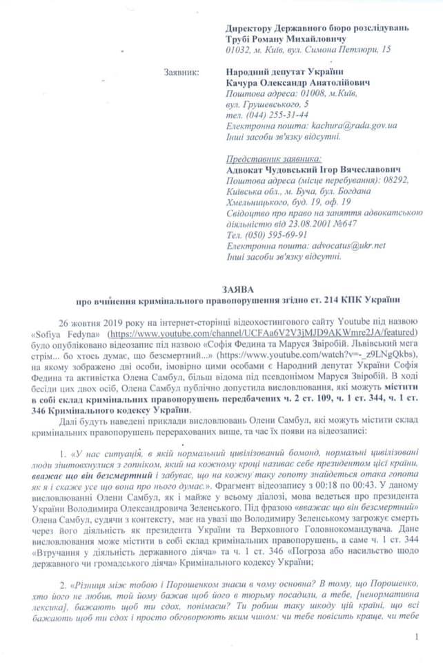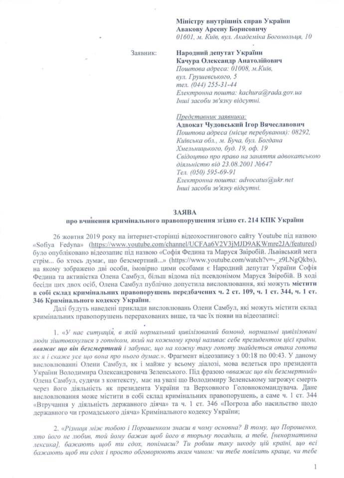 Нардеп от фракции "Слуга народа" Александр Качура опубликовал документы, подтверждающие, что он подал в правоохранительные органы заявление на депутата из фракции "ЕС" Софию Федину и активистку Елену Самбул, более известную под псевдонимом Маруся Зверобой. Поводом послужили их некорректные высказывания в адрес президента Украины Владимира Зеленского.