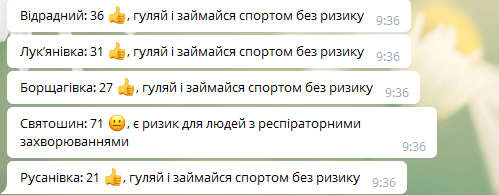 По данным телеграмм-бота "Индекс качества воздуха в Киеве", также риск для здоровья, связанный с качеством воздуха, наблюдается в Голосеево и Святошино.