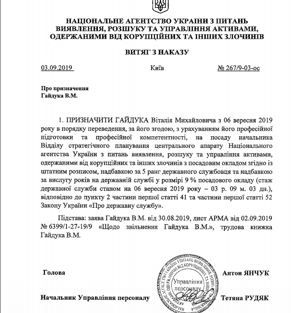 Виталий Гайдук стал начальником отдела стратегического планирования центрального аппарата Национального агентства Украины по вопросам выявления, розыска и управления активами (АРМА). Об этом стало известно из ответа агентства на запрос главы общественного совета при АРМА Глеба Каневского.