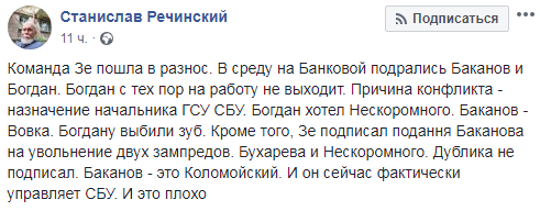 По его словам, причиной конфликта было назначение начальника Главного следственного управления СБУ. Богдан якобы выступал за кандидатуру замглавы СБУ Дмитрия Нескоромного, Баканов – за Василия Вовка, который ранее занимал эту должность.