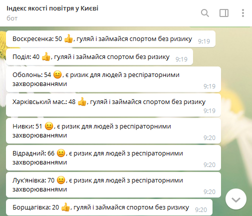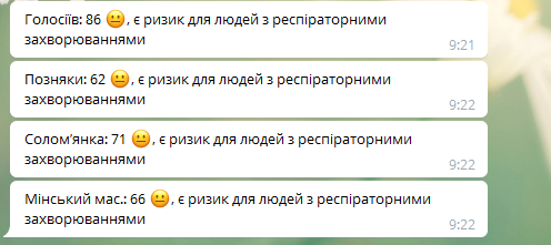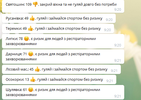 По данным телеграмм-бота "Индекс качества воздуха в Киеве", наиболее воздух загрязнен в Святошино, В этом районе не рекомендуется гулять без необходимости, поскольку есть риск для здоровья.
