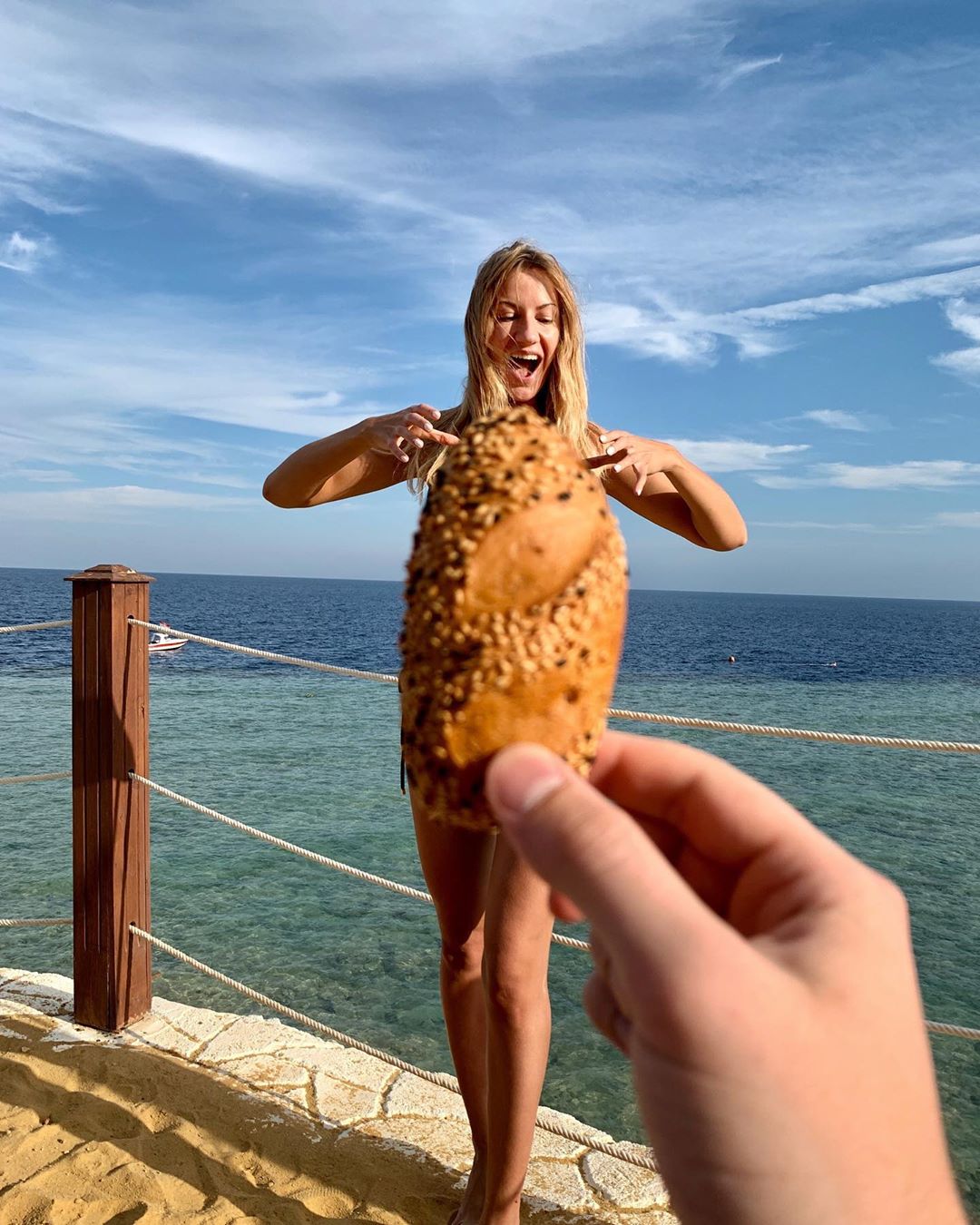 В Instagram теледива опубликовала весьма провокационное забавное фото. На снимке она позирует на залитом солнцем пирсе. При этом фотограф, снимающий звезду, держит в руках румяную булочку, которой полностью закрыл тело Леси. Поклонникам осталось только любоваться стройными ножками ведущей.