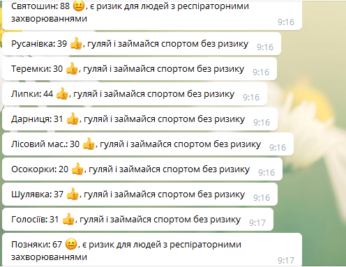 Самые безопасные по качеству воздуха районы - Подол, Харьковский массив, Борщаговка, Русановка, Теремки, Липки, Дарница, Лесной массив, Осокорки, Шулявка, Голоссев, Соломенка.